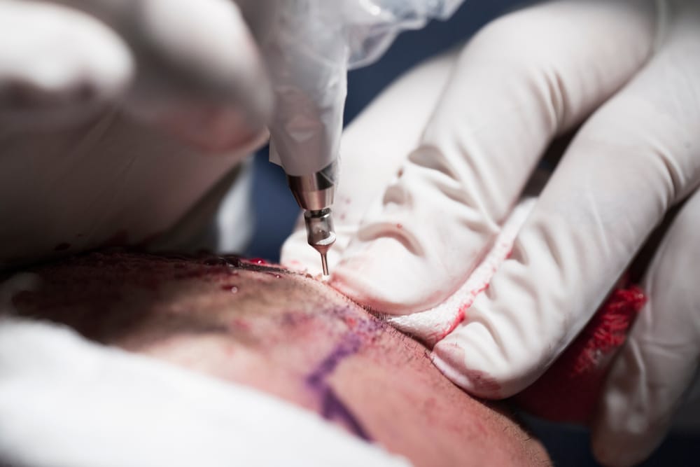 Avant l’extraction des greffons, le praticien effectue une anesthésie locale sur la zone donneuse par une injection sous cutanée. Le but étant de rendre l’intervention complètement indolore, raison pour laquelle les patients ne ressentent aucune douleur lors du prélèvement des greffons. La présence de ce produit dans la zone sous cutanée peut entraîner un gonflement sur la partie supérieure du visage, notamment sur le front et parfois au niveau des yeux.